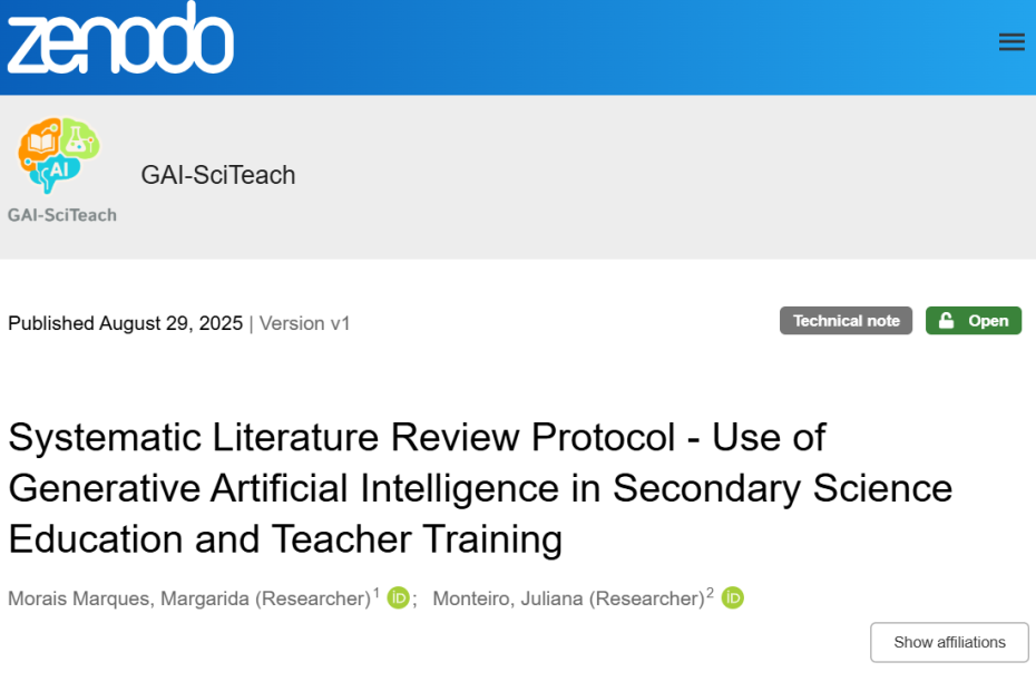 Morais Marques, M., & Monteiro, J. (2025). Systematic Literature Review Protocol – Use of Generative Artificial Intelligence in Secondary Science Education and Teacher Training. Zenodo. https://doi.org/10.5281/zenodo.16985820 https://zenodo.org/records/16985820